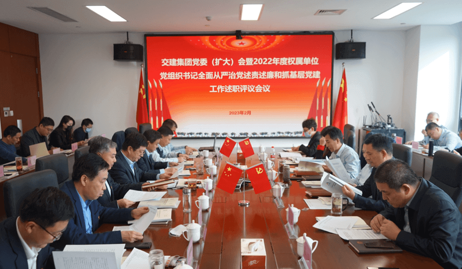 为进一步压紧压实从严治党责任,充分发挥党建引领作用,扎实推动重点工作任务落实落地,交建集团于2月2日召开党委(扩大)会暨2022年度权属单位党组织书记全面从严治党述责述廉和抓基层党建工作述职评议会议及2022年度本部部室年度述职会议。交建集团党委班子成员、高管人员、各权属单位党组织书记、本部各部室主要负责人及部分职工代表参加会议。